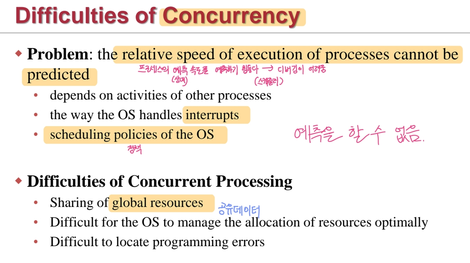 - ๋๋ฒ๊น ์ด ๋๋ฌด ์ด๋ ค์ด ๋จ์ : Scheduler์ ๊ฒฐ๊ณผ๋ฅผ ์์ธก์ ํ ์๊ฐ ์์. Problem : the relative speed of execution of processes cannot be predicted